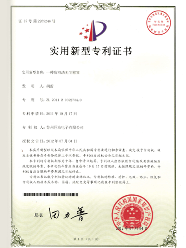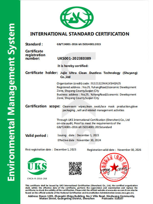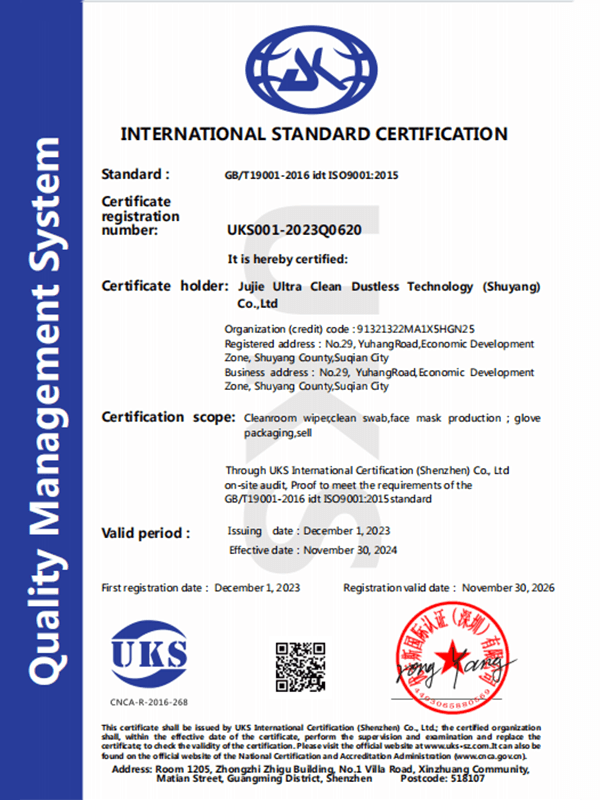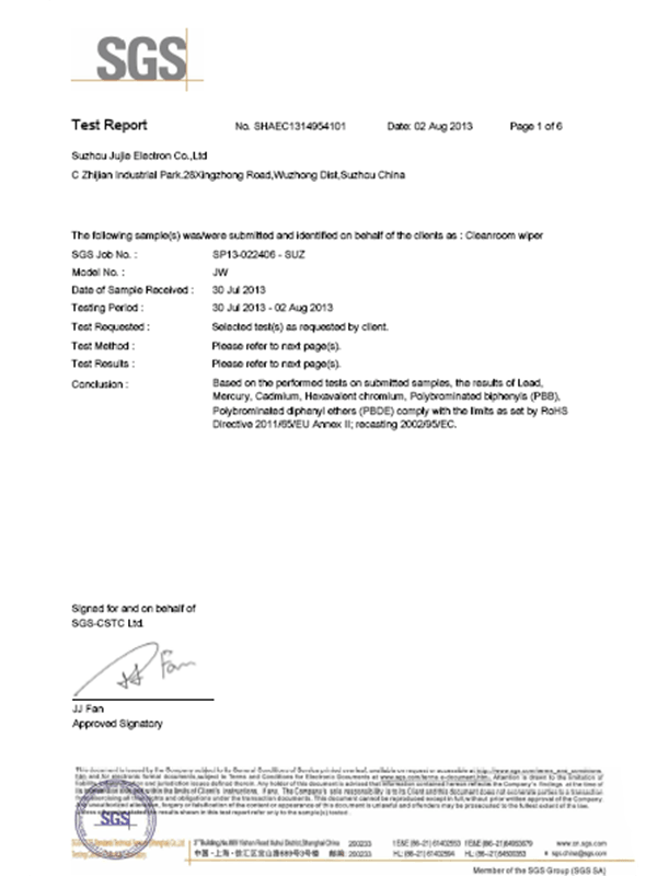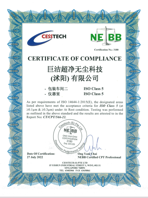 Seiceáil go bhfuil deimhniú tionscal an tseomra glantacháin rite ag an táirge. Buaileann gach tomhaltán ag Suzhou Jujie Electronics le caighdeáin ISO Aicme 5/6 agus soláthraíonn siad tuarascálacha tástála tríú páirtí.